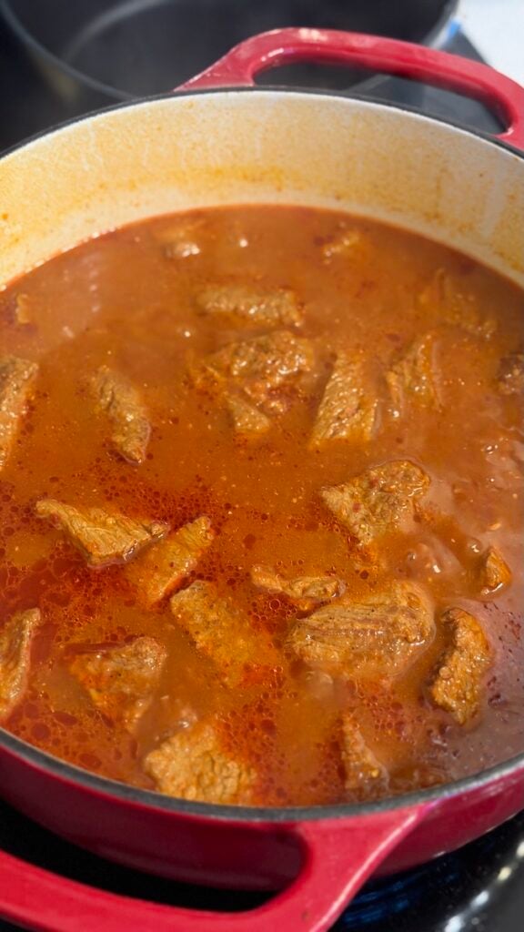 - Pour the chili paste over the seared meat. Add the beef broth (enough to generously cover the meat) and the bay leaves. Bring to a boil, then reduce the heat to low, cover, and let it simmer for 3.5 to 4 hours, or until the meat is completely fork-tender.