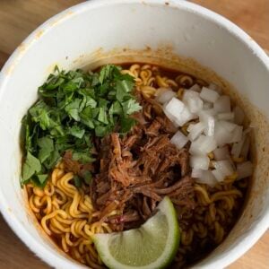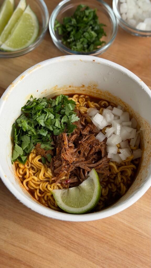 - Remove the lid, stir the noodles, and add a generous scoop of the shredded Birria meat (if you want). Top with fresh chopped cilantro, onion, and a lime wedge.