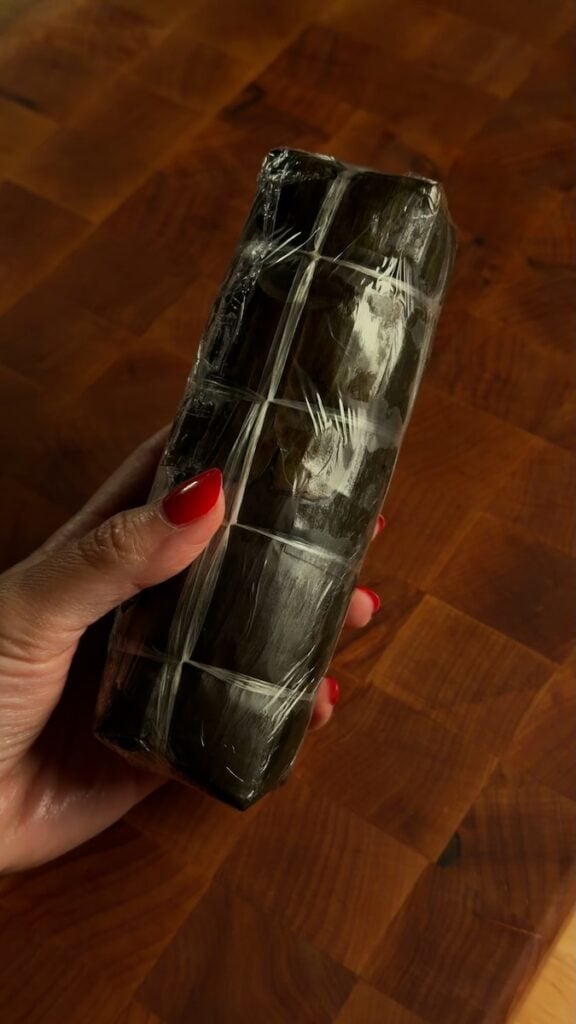 I was originally going to use tofu, but when I saw Bรกnh Tรฉt (the log-shaped Vietnamese sticky rice filled with mung bean and pork belly) in the checkout line, I knew I had to swap it out. (Note: I accidentally called this Banh Chung in the video. I always mix up the square vs. log shapes!) These are easy to pan-fry and get crispy!